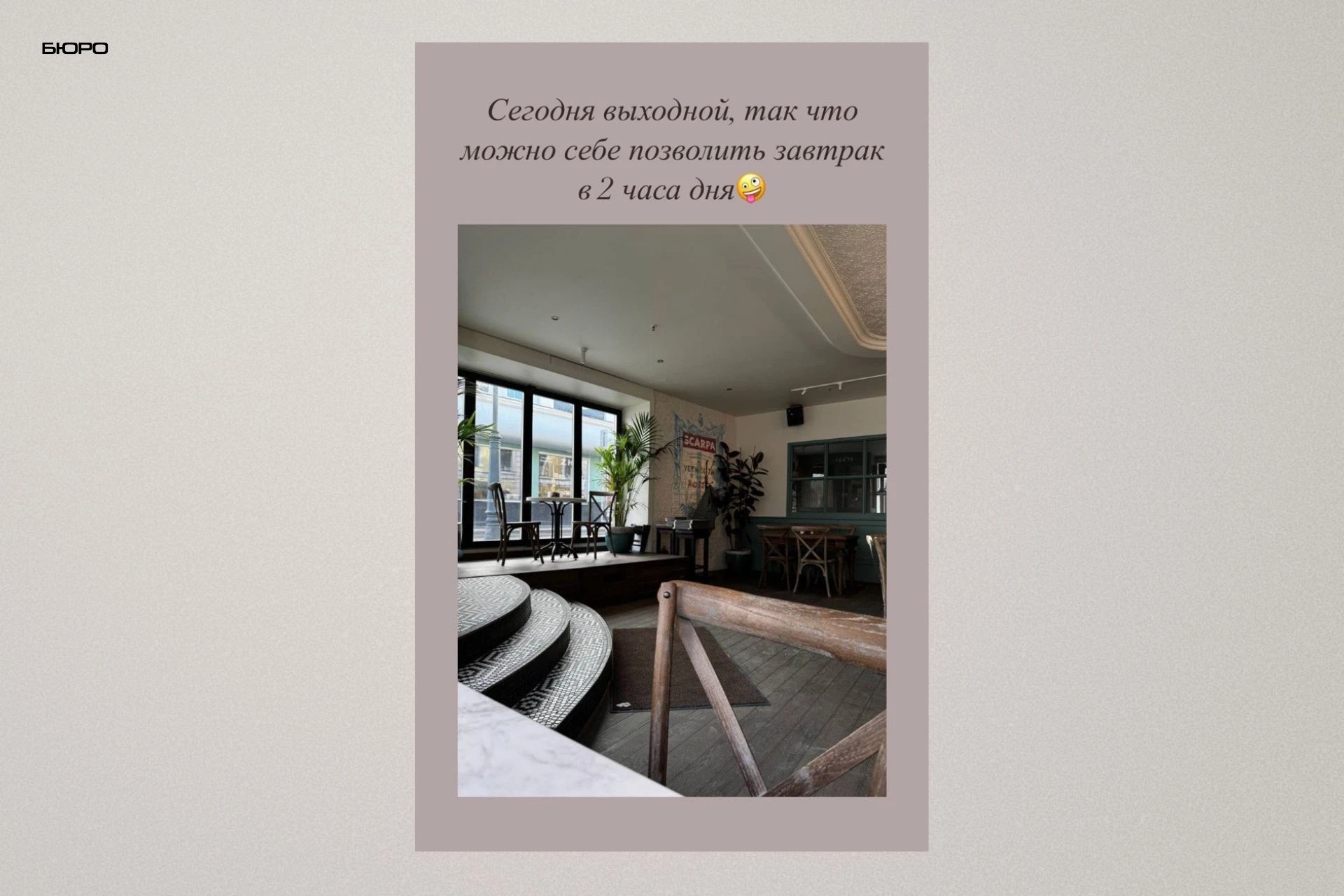«Сегодня выходной, так что можно себе позволить завтрак в 2 часа дня», – рассказала Анастасия Лукашенко и поделилась фото итальянского бистро De torino на Мясницкой улице в районе Лубянки.
